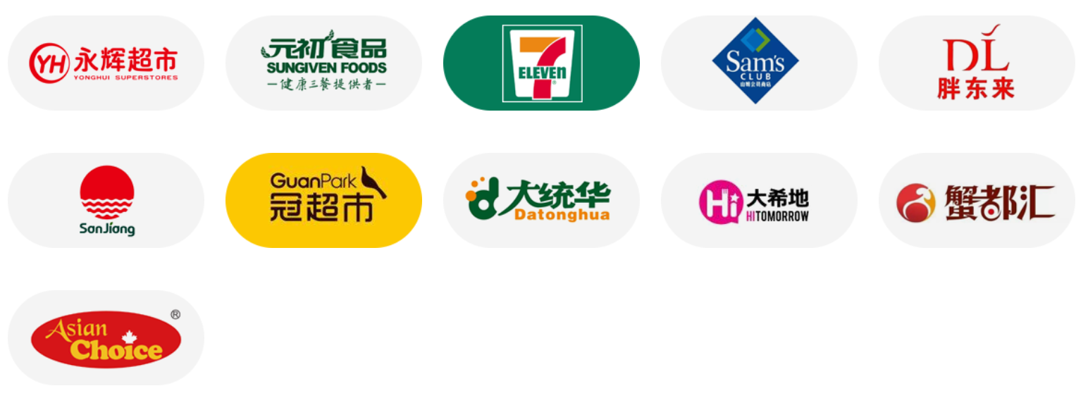 零售客戶:永輝超市、元初食品、7-11便利店、山姆大叔、胖東來、三江購物、冠超市、大統(tǒng)華、大希地、蟹都匯、Asian Choice